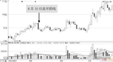 “高开阴线”与“低开阳线”刚好相反,它是指开盘后价格大幅跳空高开,但高开后价格并没有高走,而是出现震荡着向下滑落的态势,收盘时收出一根高开低走的大阴线。