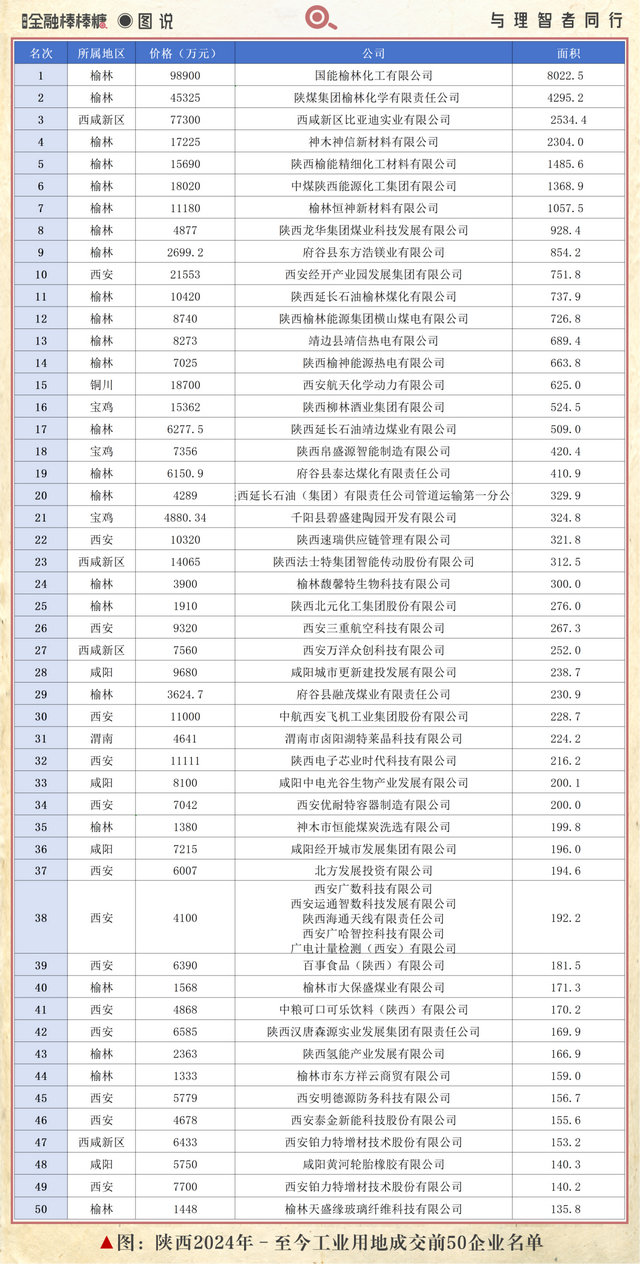 再来看陕西“工业用地成交前50企业”的具体名单,其中有几个鲜明特点: