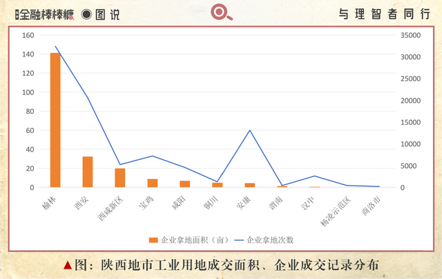 具体到城市,榆林以148次的企业成交记录以及3.08万亩的面积,断崖式领先;西安则以94次以及7082亩的面积位居第二,余下分别为西咸、宝鸡咸阳等地市。